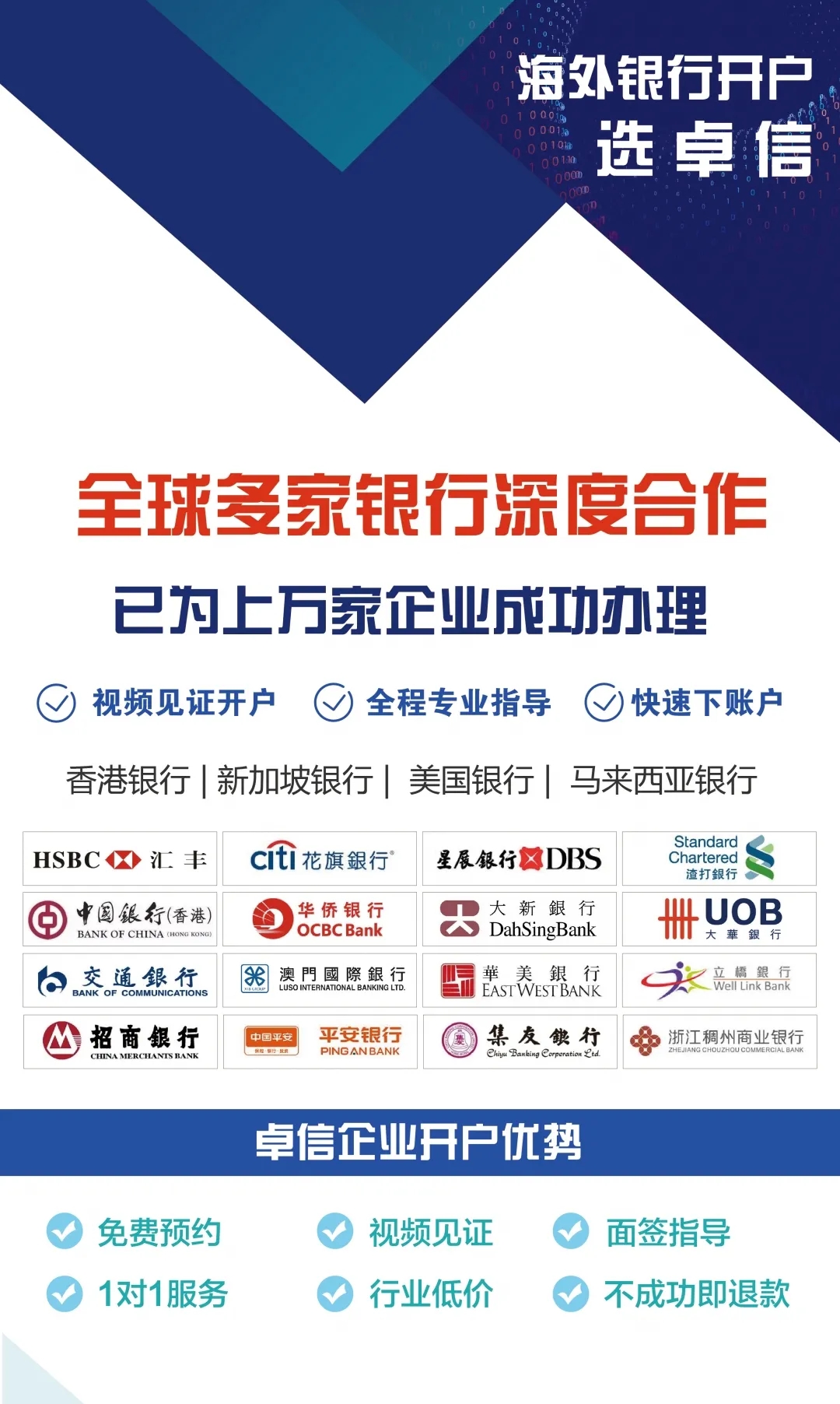 卓信擁有多年開戶經(jīng)驗(yàn),與多家銀行有良好合作關(guān)系,為客戶提供免費(fèi)開戶預(yù)約服務(wù),國內(nèi)視頻見證開戶,全程保駕護(hù)航,歡迎隨時聯(lián)系!