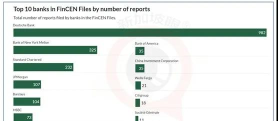 “可疑交易”份數(shù)最高的10家銀行依此為:德意志銀行、紐約梅隆銀行、渣打銀行、摩根大通、巴克萊銀行、匯豐銀行、美國銀行、中國投資有限責任公司、美國富國銀行、花旗集體、法國興業(yè)銀行。