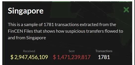 這批文件也顯示,其間共有1781宗“可疑交易”流經(jīng)新加坡,流入新加坡的資金總額為29億4746萬美元,從新加坡流出的資金有14億7124萬美元。