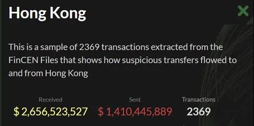 同時,文件顯示有2369宗“可疑交易”與香港特區(qū)有關,有超過26億美元流入香港,14億美元從香港流出。