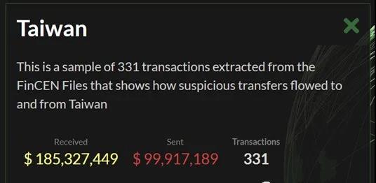 文件顯示有331宗“可疑交易”與臺灣地區(qū)有關,有超過1.85億美元流入臺灣,近1億美元從臺灣流出。