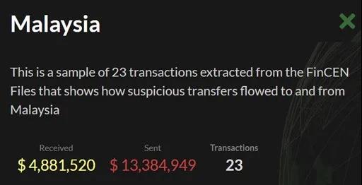 文件顯示有23宗“可疑交易”與馬來西亞有關,有488萬美元流入大馬,1338萬美元從大馬流出。