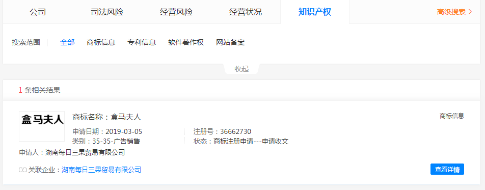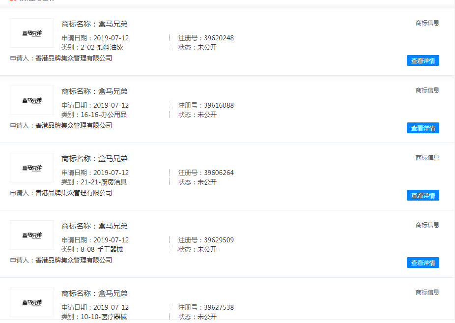 我們通過天眼查發(fā)現(xiàn),“盒馬夫人”、“盒馬爸爸”都是湖南每日三果貿易有限公司注冊,“盒馬兄弟”商標持有人是香港品牌集眾管理有限公司,“盒馬小姐”持有者是哈爾濱市香坊區(qū)盒馬小姐咖喱屋,目前該公司顯示已注銷。