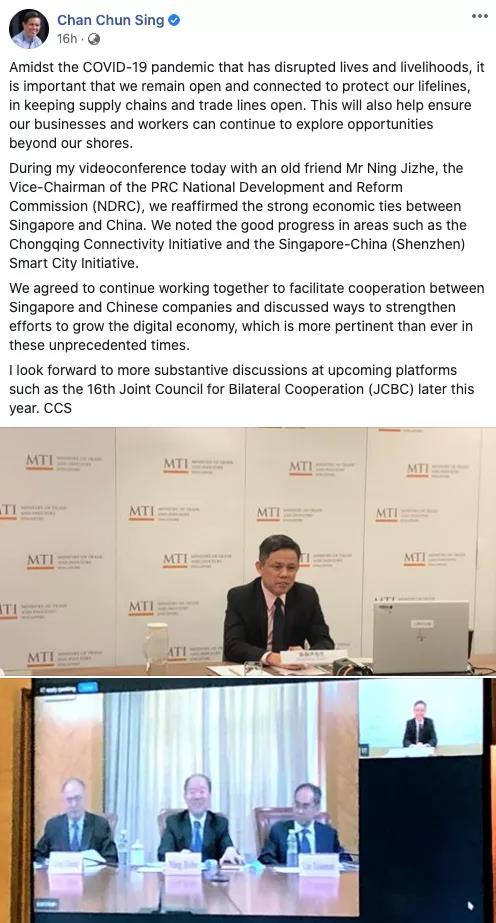 在中國(guó)的一帶一路倡議、政府與政府的項(xiàng)目和中新(重慶)互聯(lián)互通倡議這一系列新的國(guó)際陸海貿(mào)易走廊框架下,陳振聲部長(zhǎng)肯定了新加坡和中國(guó)深厚的經(jīng)濟(jì)聯(lián)系。陳振聲部長(zhǎng)在視頻會(huì)議結(jié)束后的臉書發(fā)帖表示,新加坡保持開放和連接,從而保護(hù)生命線,保持供應(yīng)鏈和貿(mào)易線的開放,是非常重要的。這也將有助于確保新加坡的企業(yè)和工人能夠繼續(xù)探索海外機(jī)會(huì)。